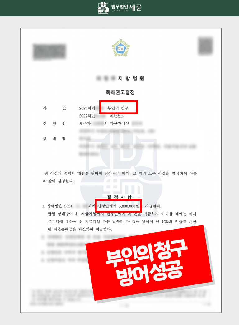게다가 채무자는 아직 젊은 나이에 있고 시어머님이 충분히 지원 능력이 되는 것으로 알고 있다며, 채무자에게 파산선고가 적절한 것인지 의구심이 든다고 밝혔습니다. 이러한 조력으로 우리 의뢰인은 부인의 청구를 성공적으로 방어할 수 있었는데요.