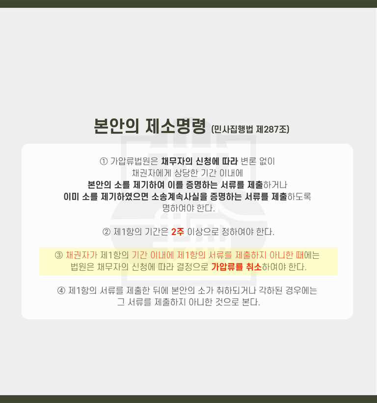 한편, 제소명령신청 과정은 그 자체가 어렵지는 않은데요. 각 사안의 전반적인 절차들을 모두 이해하여 의뢰인에게 가장 효율적인 방법이 무엇인지 파악하는 것이 관건입니다. 이후 신청이 인용되면 제소기간도과에 의한 가압류취소 신청을 하여, 상대방의 허점과 현 상황에 대해 적극적으로 입증해야 하지요.