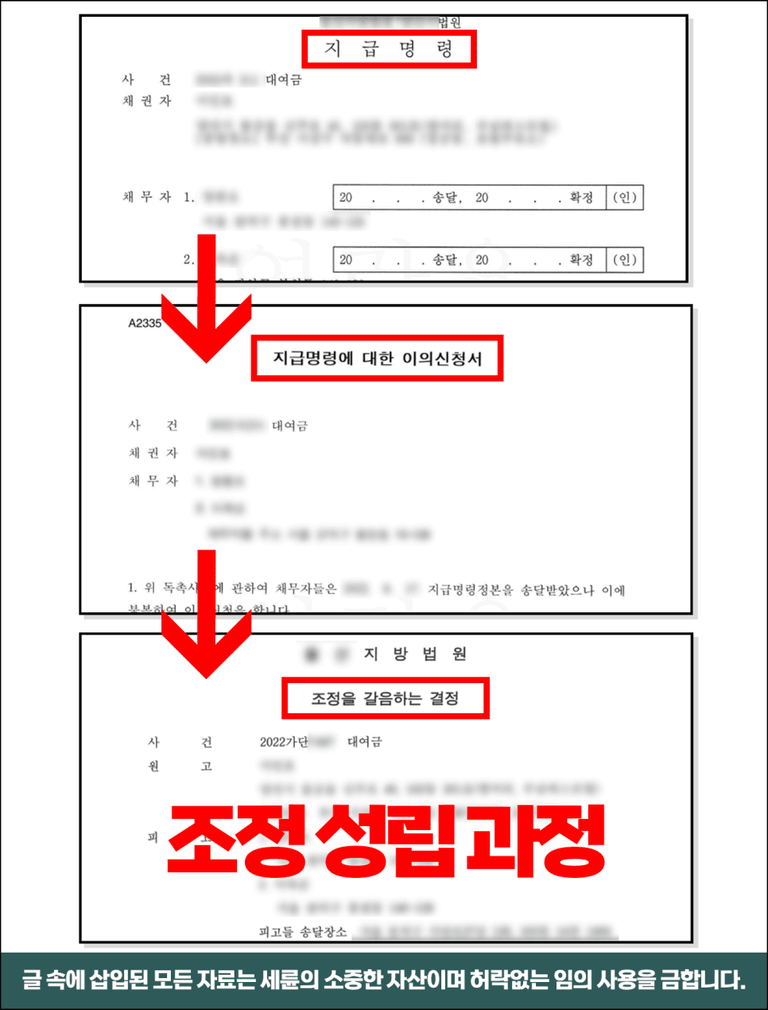 지급명령신청을 하고 이의가 없다면 확정되어 소송(별도의 집행문이 필요 없는)과 같은 효력의 받게 되지만, 이 사건의 경우 김씨는 이의신청 기간인 2주 이내의 기간 내에 이의신청을 했고, 결국 소송으로 넘어가 재판을 하게 됩니다.