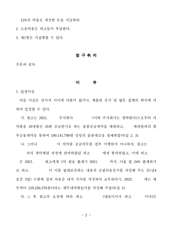 의뢰인은 약사인데 피고를 통하여 의약품 물품공급계약을 체결하고 물품대금을 전부 지급하였는데 의약품을 제대로 지급받지 못하였고 피고에게 항의하자 피고가 개인적으로 이를 변제하기로 하는 각서를 작성하였고 피고가 대표이사인 피고 법인이 위 채무를 인수하기로 하는 채무인수계약서를 작성하였습니다.