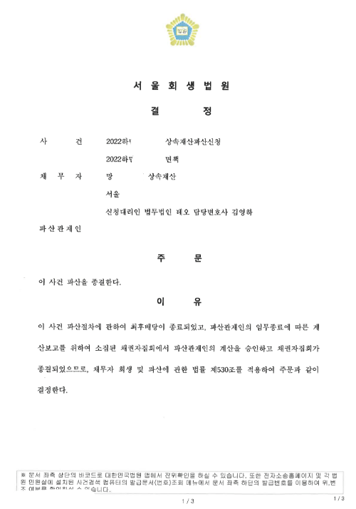 신청 중 사망하여 그 자녀들(상속인)들을 위한 상속재산 파산신청으로 절차 변경하였습니다.