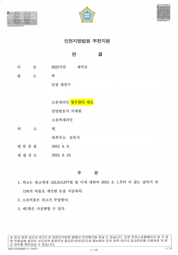 소송비용 또한 피고가 부담한다는 원고 전부 승소 판결을 받았습니다.