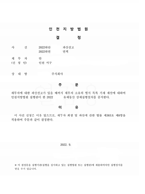 파산 재판부에, 채무자 재산에 대한 일부 처분의 중지명령 신청을 하여