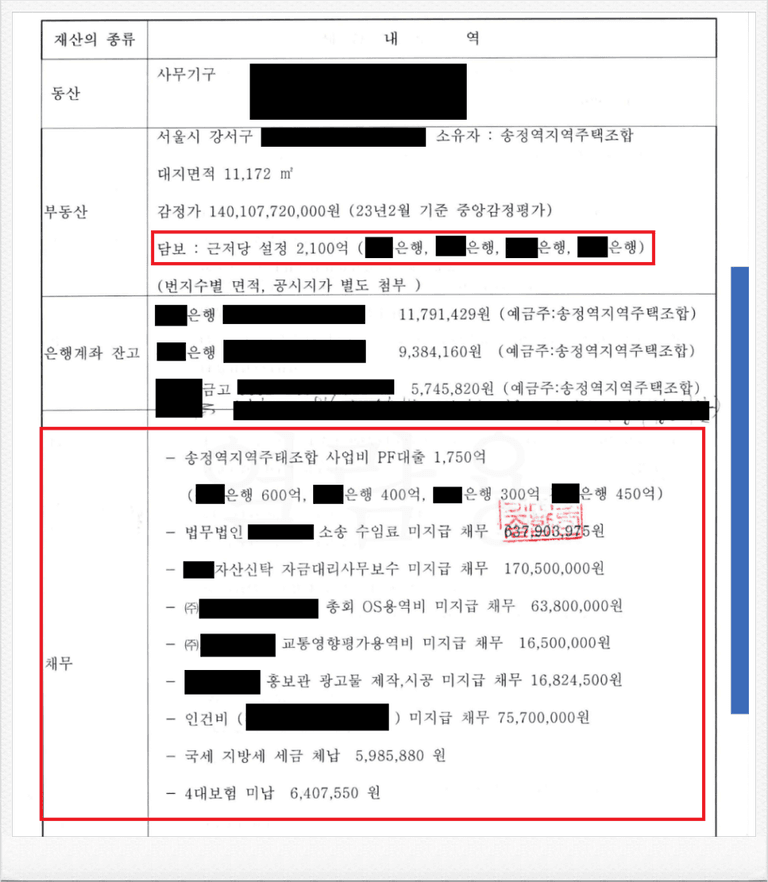최근 지역주택조합과 관련한 법적 분쟁과 사업 중단 사례가 잇따르고 있는 가운데, 송정역지역주택조합의 현재 재정 상태 또한 매우 신중하게 살펴볼 필요가 있습니다. 확인된 바에 따르면, 조합이 법원에 제출한 재산목록상 보유 부동산에는 이미 담보권이 설정되어 있으며, 해당 부동산의 담보대출액이 실제 가액을 초과하는 상태로 나타나고 있습니다. 그뿐만 아니라, 수억 원대의 채무가 여전히 미지급된 상태로 확인되어, 조합의 전반적인 자금 운용 능력에 대해 심각한 우려가 제기되고 있습니다.