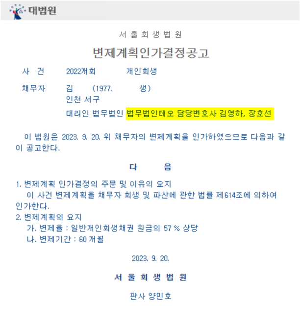 그 결과 5개월만에 2인 생계비가 포함된 변제계획안의 개시가 결정되었습니다.