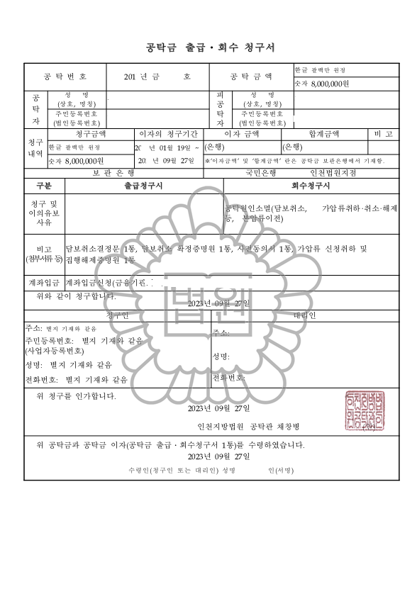 공탁금 회수 청구하였고, 청구 당일 공탁금 전액 의뢰인 계좌로 입금 완료 되었습니다.