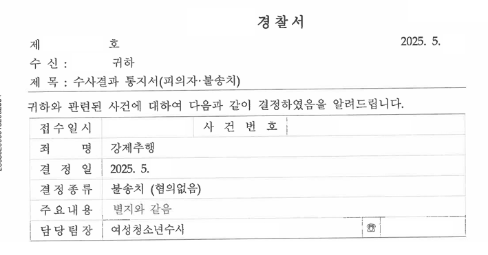 5. A씨는 강제추행죄 사건에서 저희의 조력을 받음으로써 경찰단계에서 불송치(혐의없음) 처분을 받으셨습니다.