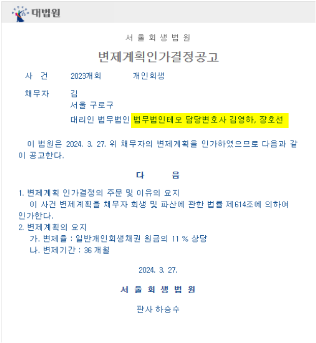 그 결과 원금 89% 탕감받는 변제계획안의 개시결정을 받을 수 있었습니다.
