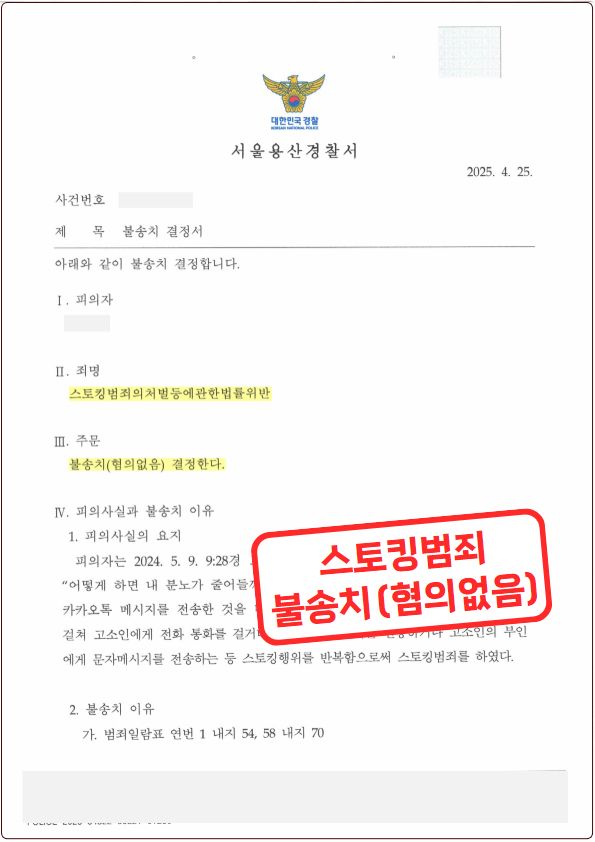 게다가 A씨는 B씨가 싫어한다는 것을 깨닫고 난 후에는 연락을 전혀 하지 않았으며, B씨가 주장하는 A씨의 연락으로 추정되는 내역은 A씨가 한 것이라고 볼만한 증거가 충분하지 않음을 들어 사건을 불송치해야함을 소명했습니다.