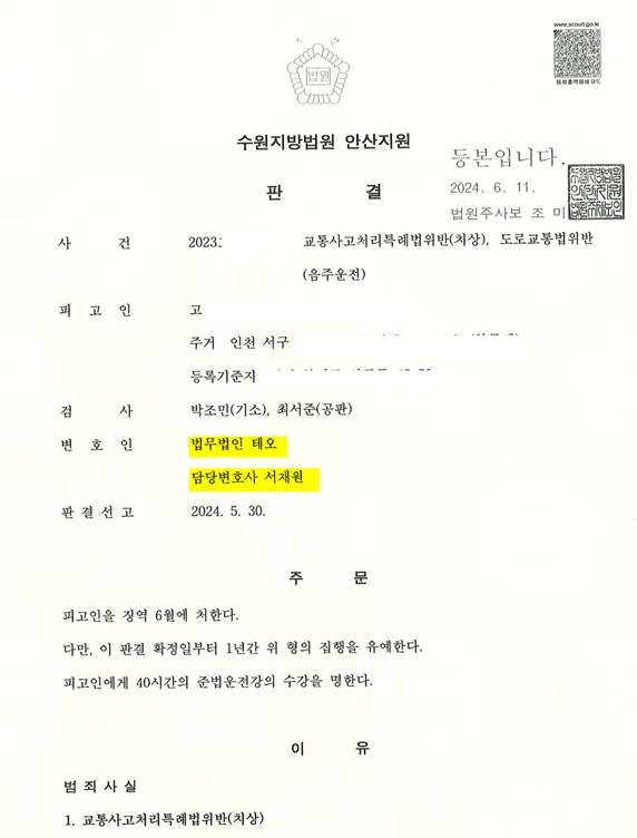 본 변호인의 조력결과, 여러 양형조건을 참작하여 법원은 의뢰인에게 징역형의 집행유예를 선고하였습니다.