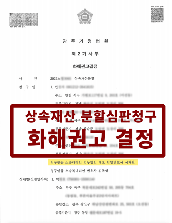 재판부에서는 저희가 제출한 상속재산분할협의서를 토대로 화해권고결정을 내렸습니다.
