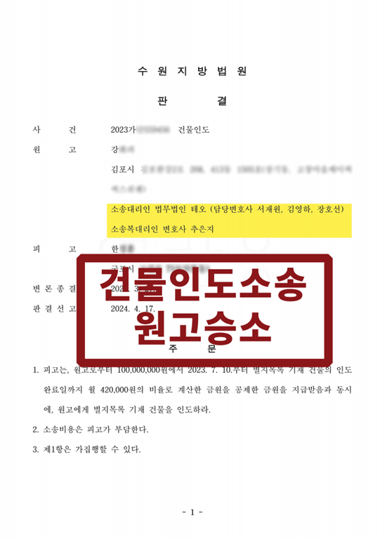 재판부에서는 본 변호사의 변론을 받아들여 원고의 청구취지를 받아들여 원고에게 보증금 잔액을 지급받음과 동시에 건물을 인도하라는 판결을 내렸고, 소송비용까지 모두 피고가 부담하도록 하여 원고(의뢰인) 전부 승소판결을 내렸고 위 판결문을 집행권원으로 하여 명도집행을 진행하고 있습니다.