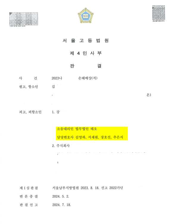 피고 주식회사는 화장품 제조 판매업 등을 하는 법인이며, 피고(의뢰인)는 피고 주식회사를 실질적으로 운영하는 사람이었습니다. 원고는 제작자이자 저작권자로서 피고들의 불법행위에 따라 손해를 입은 피해자라고 주장하며 피고는 원고의 저작재산권을 복제 및 공중송신의 방법으로 침해하였으므로 손해를 배상하라는 청구를 하였습니다. 원고는 1심에서 원고가 청구한 손해배상액 5억원 중 8백만원을 손해액으로 인정하고, 소송비용 중 90%를 원고가 부담한다는 1심 판결에 불복하여 항소를 제기하였습니다.