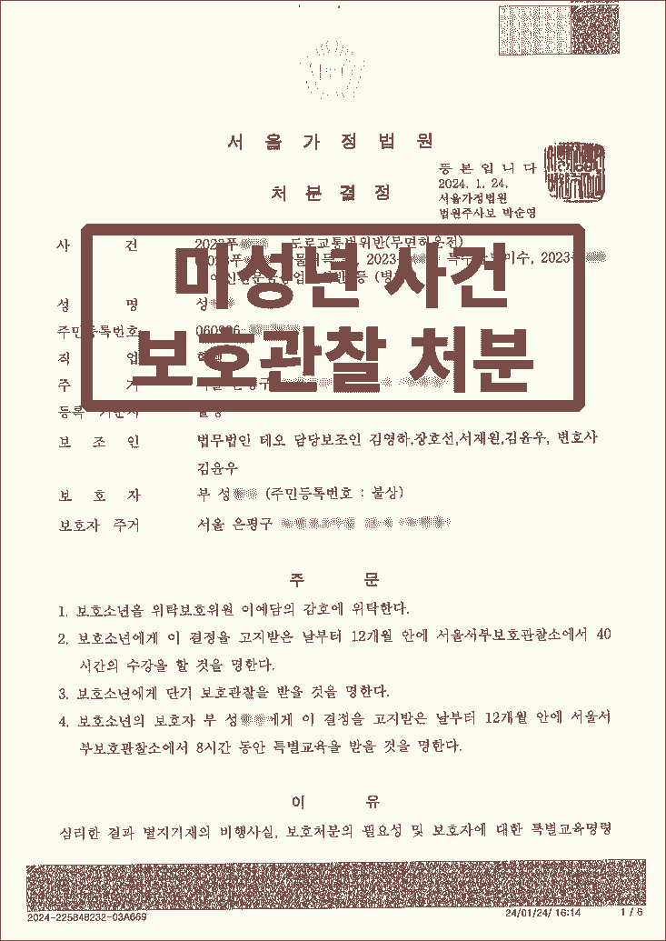 의뢰인은 비행사실에 비해 가벼운 1호·2호·4호 처분만을 받게 되었으며 법무법인 테오는 소년원 송치를 방어할 수 있었습니다.