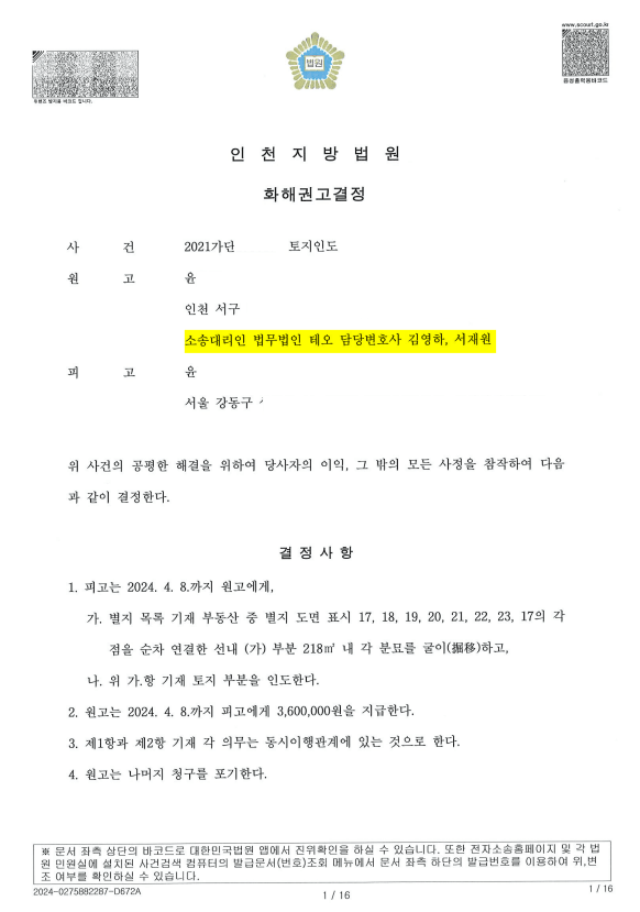 법원에서는 원고와 피고의 합의내용에 따라 피고는 원고에게 이 사건 분묘를 철거하고, 토지를 인도하라는 화해권고결정을 내렸습니다.