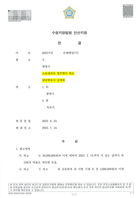 재판부에서는 원고의 청구를 인용하여 피고들은 원고에게 30,000,000원의 손해배상금을 지급하라는 판결을 내렸습니다.