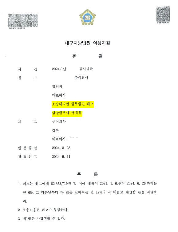 재판부에서는 원고의 주장을 받아들여 공사대금반환 청구인용판결을 내렸고 본 변호인은 위 판결이 확정된 후 의뢰인이 가압류 해두었던 피고의 제3자에 대한 채권을 본압류로 이전하여 금원을 반환받을 수 있도록 조력하였고 피고는 실제로 청구금액 전액을 반환받았습니다.