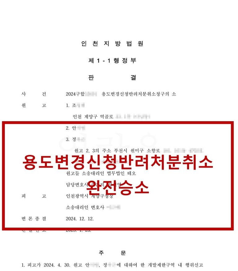 이에 본 변호사는 구청이 의뢰인에 대하여 한 용도 및 표시변경신청 거부처분을 취소한다는 판결을 받을 수 있었습니다.
