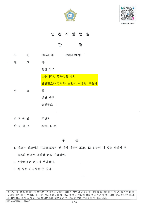 재판부는 원고(의뢰인)의 청구를 전부 인용하는 원고 승소판결을 내렸습니다.