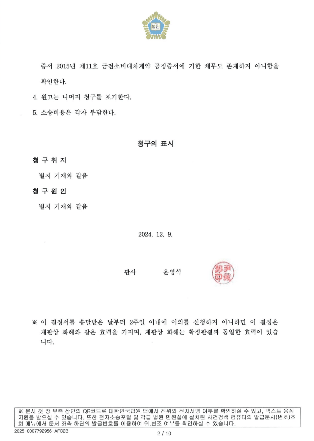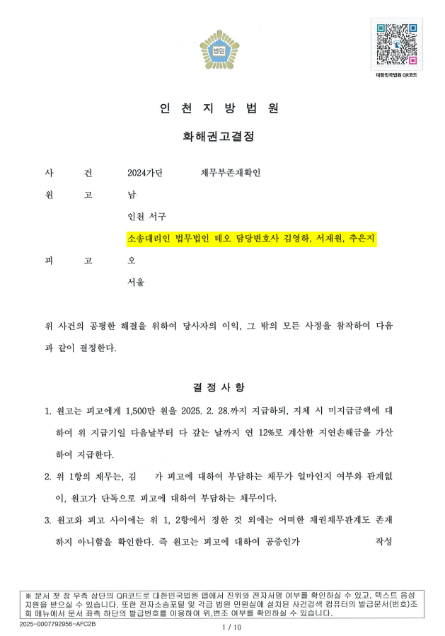 재판부는 원고(의뢰인)의 채무액이었던 약 8천만 원 중 1,500만 원을 피고(상대방)에게 지급하고, 이 외에는 어떠한 채권채무관계도 존재하지 않는다는 화해권고결정을 내렸습니다.