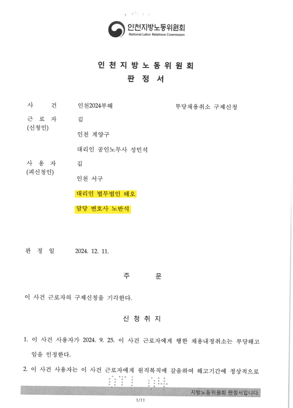 법무법인 테오 변호사들의 조력결과 부당해고 구제신청사건은 기각되었고, 의뢰인도 본 건으로 인해 마음고생을 많이 했는데, 결과에 매우 흡족해 하셨습니다.