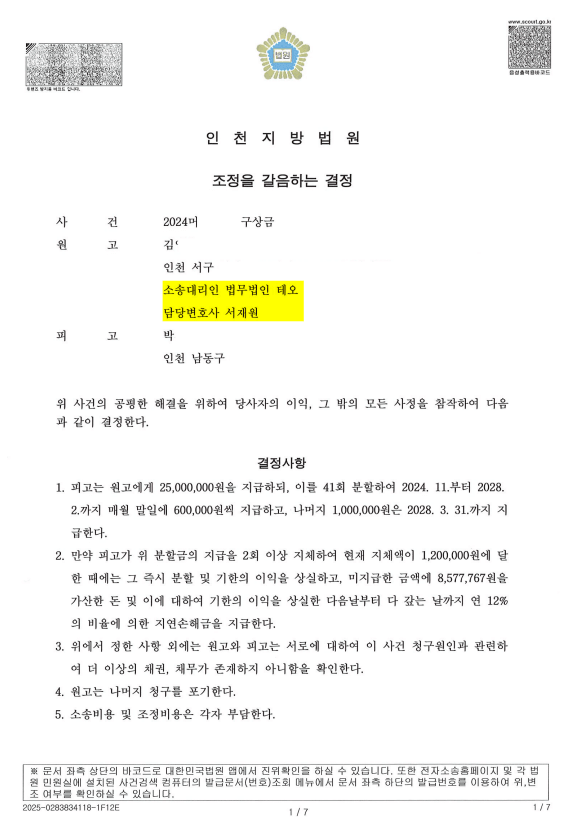 재판부는 이 사건을 조정에 회부하고, 피고(상대방)가 원고(의뢰인)에게 청구금액 중 일부를 분할하여 지급하고, 소송비용은 각자가 부담하는 조정을 갈음하는 결정을 내렸습니다.
