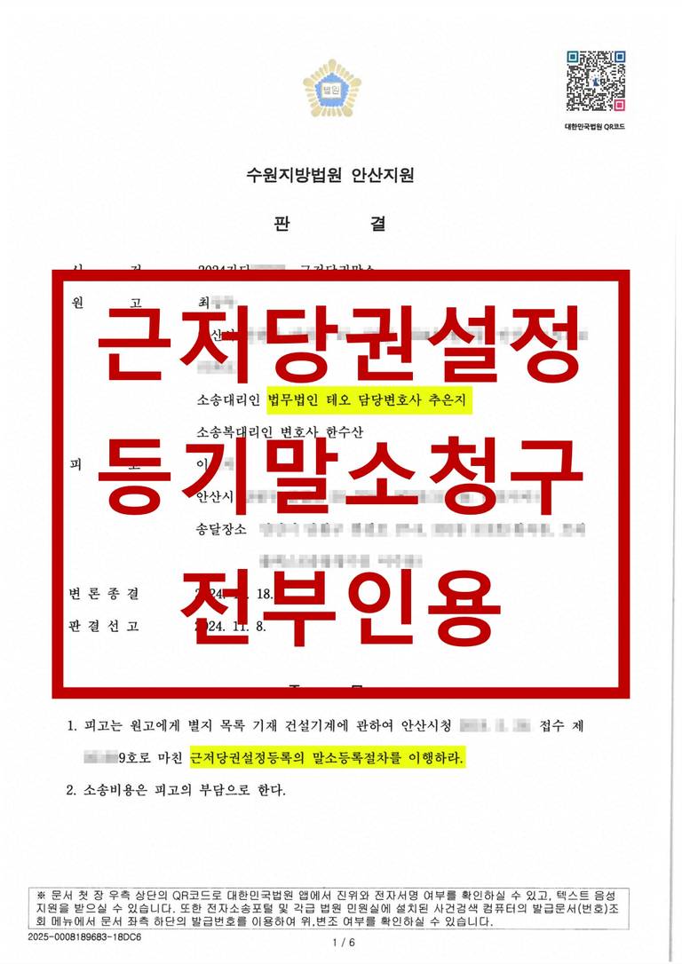 법원은 법무법인 테오의 주장과 입증을 받아들여, 상대방의 근저당권 설정이 근거가 없음을 인정했습니다. 결과적으로 근저당권설정등록 말소 판결이 내려져 의뢰인은 부당한 부담에서 벗어나 재산권을 회복할 수 있었습니다.