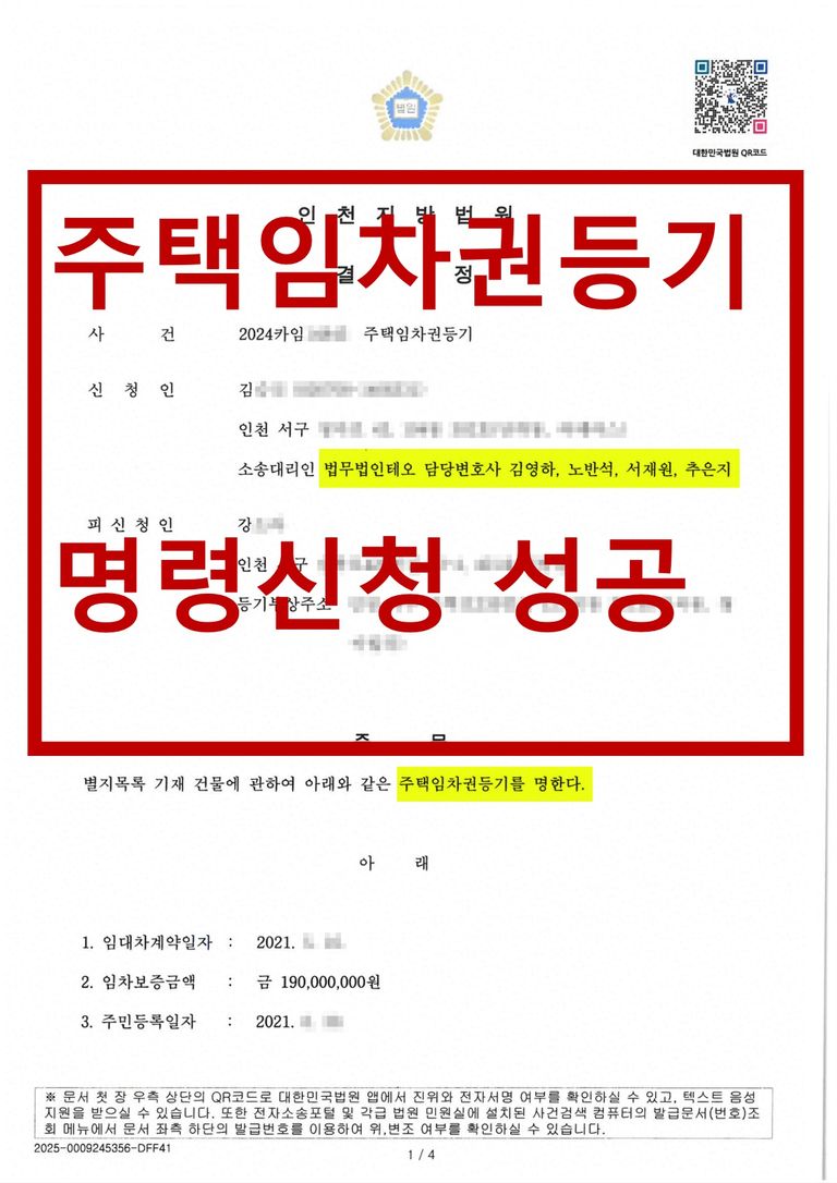 의뢰인은 인천 서구에 위치한 주택에 대해 임차보증금 1억 9천만 원의 임대차계약을 체결하고 거주하고 있었습니다. 그러나 임대차 종료 후 보증금을 반환받지 못한 상황에서, 주택임차권등기명령을 통해 권리를 보존하고자 법적 조치를 취하게 되었습니다.