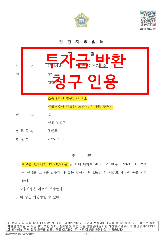 조속한 소장송달과 함께 투자금 및 수익금을 지급하라는 판결을 받을 수 있었습니다.