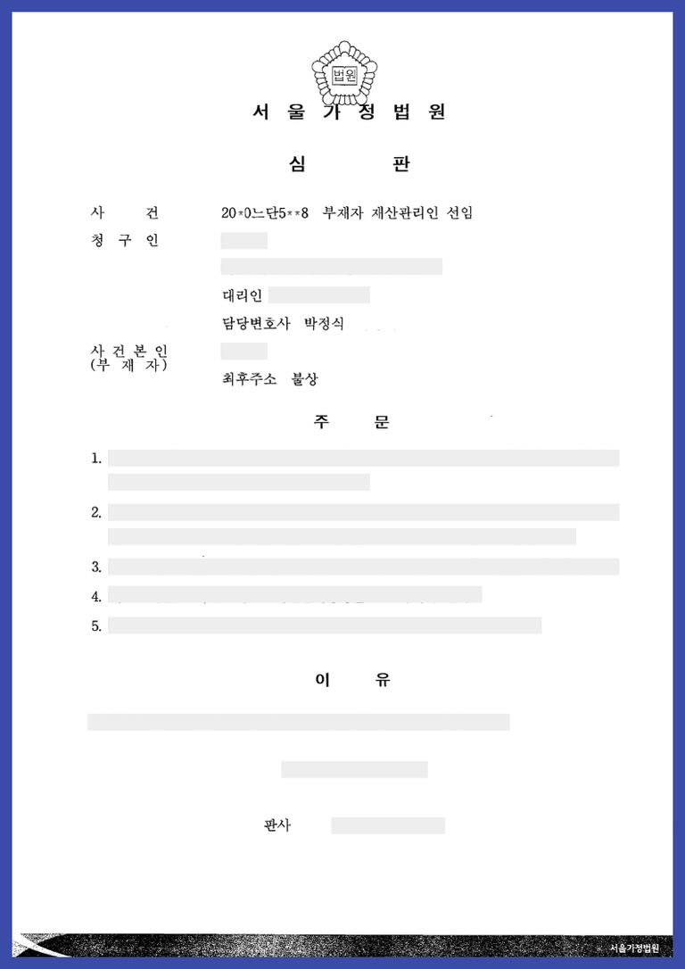 사건본인(부재자)은 망인과 소외 1 사이에 태어난 자녀입니다. 이처럼 사건본인은 망인의 상속인인데, 행방불명된 자로서 사건본인의 최후주소를 알 수 없었습니다.