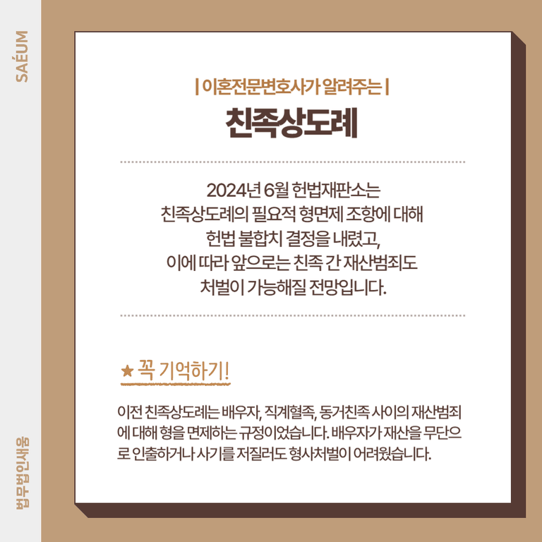 기존 형법상 친족상도례(형법 제328조)는 배우자, 직계혈족, 동거친족 사이의 재산범죄에 대해 형을 면제하는 규정이었습니다. 이로 인해 배우자가 재산을 무단으로 인출하거나 사기 행위를 저질러도 형사처벌이 어려웠습니다. 그러나 2024년 6월 헌법재판소는 친족상도례의 필요적 형면제 조항에 대해 헌법불합치 결정을 내렸고, 이에 따라 앞으로는 친족 간 재산범죄도 처벌이 가능해질 전망입니다.