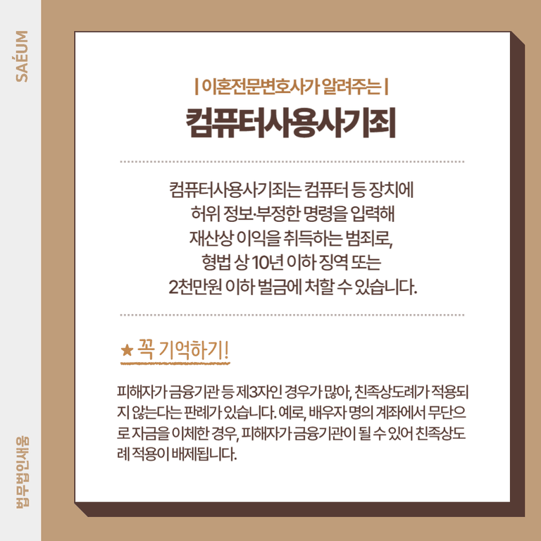 컴퓨터사용사기죄의 피해자가 금융기관이 될 수 있음을 입증해 친족상도례 적용 배제 주장