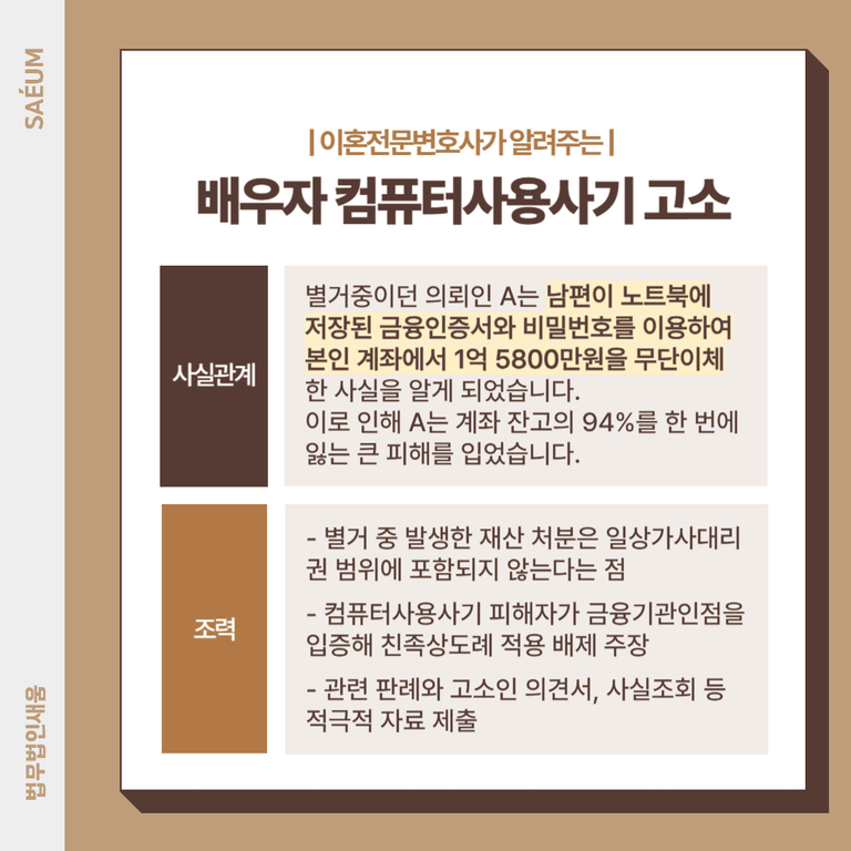 의뢰인 A씨는 남편 B씨와 별거 중이던 상황에서, 공동으로 사용하던 노트북에 저장된 금융공동인증서와 비밀번호를 이용해 B씨가 A씨 계좌에서 약 1억 5,800만 원을 무단 이체한 사실을 알게 되었습니다. 이로 인해 A씨는 계좌 잔고의 94%를 한 번에 잃는 큰 피해를 입었습니다.