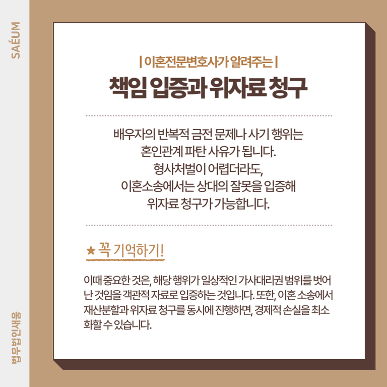 배우자의 반복적 금전 문제나 사기 행위는 혼인관계 파탄의 명백한 사유가 됩니다. 형사처벌이 어렵더라도, 이혼소송에서는 상대방의 잘못을 명확히 입증해 위자료 청구가 가능합니다. 경제적 피해뿐 아니라 정신적 고통, 신뢰 파괴 등도 위자료 산정에 반영되어 유리한 조건으로 이혼할 수 있습니다.