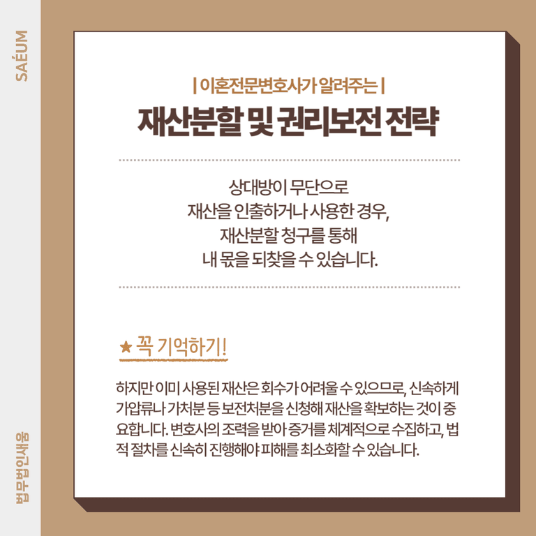 상대방이 무단으로 재산을 인출하거나 사용한 경우, 재산분할 청구를 통해 내 몫을 되찾을 수 있습니다. 하지만 이미 사용된 재산은 회수가 어려울 수 있으므로, 신속하게 가압류나 가처분 등 보전처분을 신청해 재산을 확보하는 것이 중요합니다. 이 과정에서 변호사의 조력을 받아 증거를 체계적으로 수집하고, 법적 절차를 신속히 진행해야 피해를 최소화할 수 있습니다.