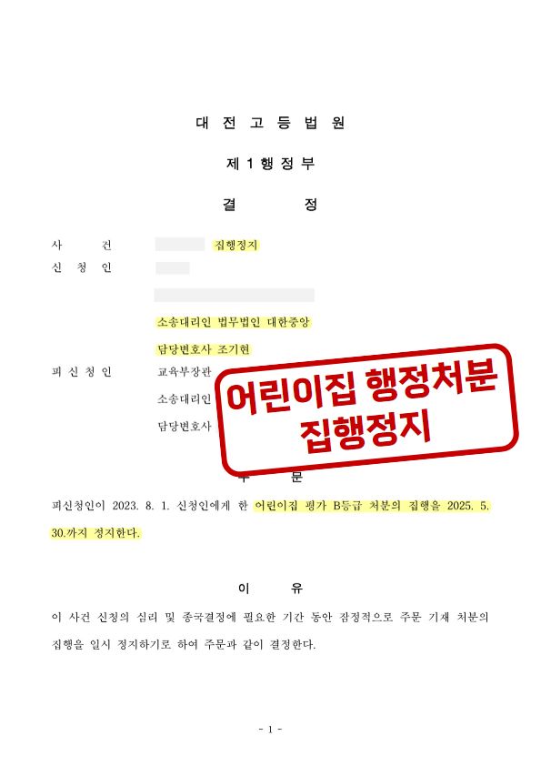 조기현 변호사는 행정절차로 대응하기 이전에 앞서, 우선 이 행정처분의 집행을 정지하여 어린이집 운영에 아무 지장이 없을 수 있도록 하는 것을 목표로 하였습니다.