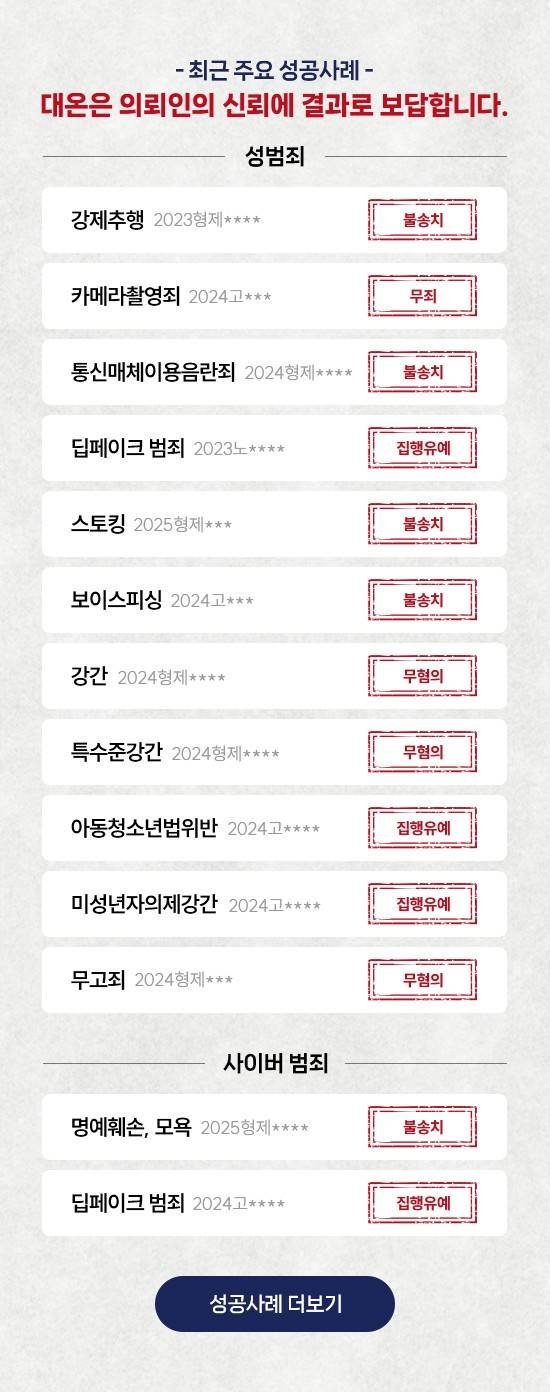 승소 경험 없는 사건은 수임하지 않습니다. 뛰어난 전문성과 축적된 노하우를 바탕으로 의뢰인과 함께합니다. 대온 법률사무소는 사건을 수임하게 되면 해당 사건과 유사한 성공 사례들을 취합하여 분석합니다. 의뢰인에게 유리한 정상은 무엇이고, 불리한 정상은 무엇인지 정리하여 최악의 경우와 최선의 경우를 예측합니다. 그리고 하급심 판례부터 대법원 판례까지 모두 검토하여 최적의 서면을 작성하여 재판부를 설득합니다. 이미 수많은 분들께서 대온의 실력을 인정하고 사건을 맡겨주고 계십니다.