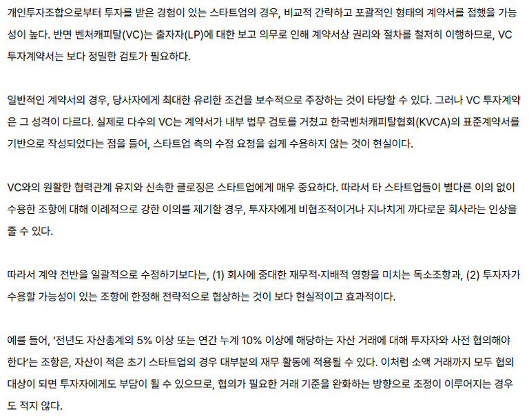 이로 인해 스타트업 측에서 수정을 요청해도 VC투자자들이 수용하지 않는 경우가 많고, 무리한 수정 요구는 오히려 투자유치 과정에서 스타트업이 협조적이지 않다는 인상을 줄 수 있습니다.