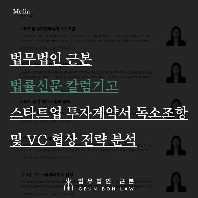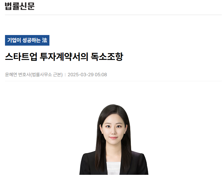윤혜연 변호사는 2025년 3월 29일자 법률신문에 스타트업 투자계약서상 독소조항과 협상전략에 관한 칼럼을 기고하였습니다.