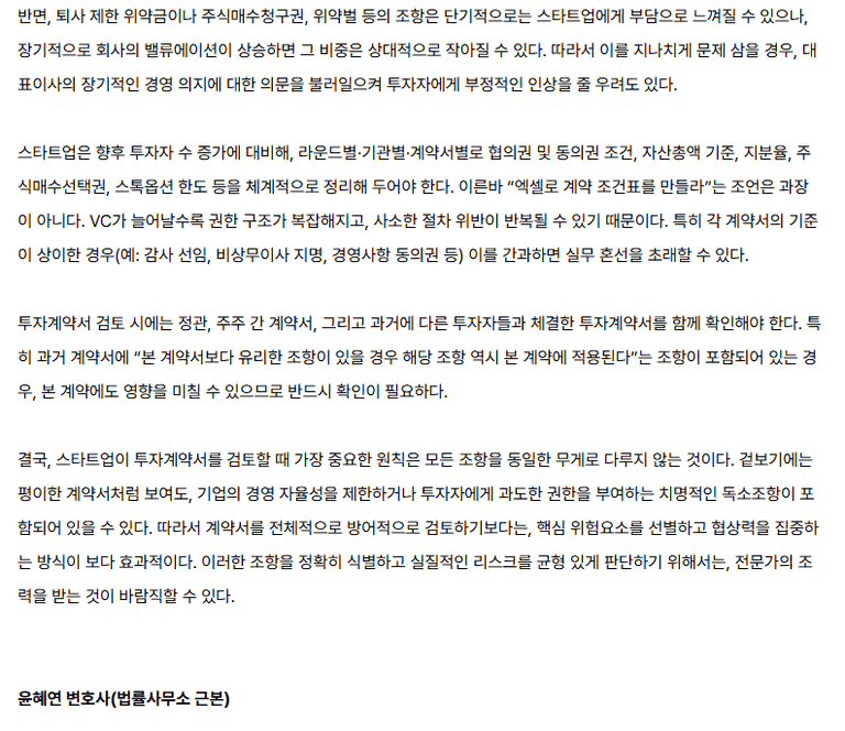• 예컨대, 자산총계 기준의 사전협의 조항은 자산 규모가 작은 초기 창업기업(시리즈A 이전 스타트업)에게 지나친 제약이 될 수 있으므로, 조정 여지가 있습니다.