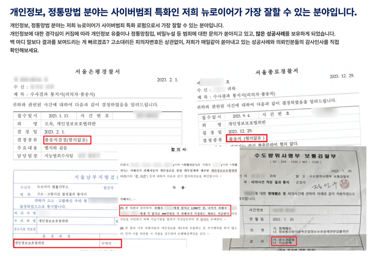 저희는 개인정보보호법 사건 뿐만 아니라 이커머스 분야까지 사건을 해결해오며 의뢰인분들께 최선의 고소 전략을 전해드리고 있습니다.