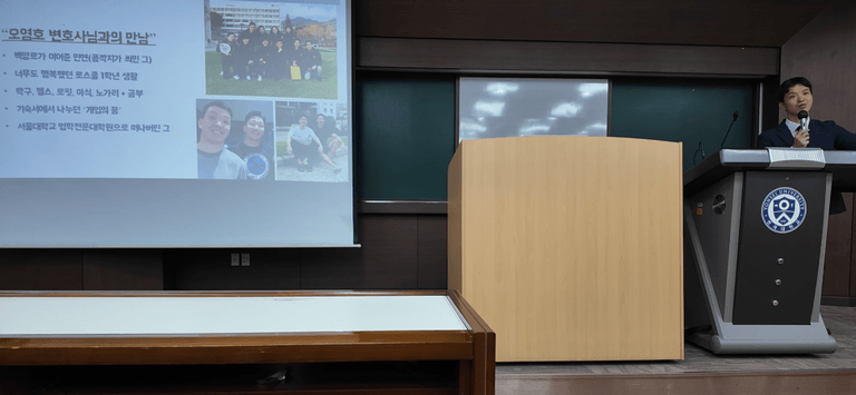 특히 이번 강연에서는 로스쿨 시절 백양로에서 처음 오영호 변호사를 만나게 된 일화를 시작으로, 함께 공부하며 나눈 '개업'이라는 공통의 꿈이 어떻게 현실로 이어졌는지를 풀어내며, 많은 학생들의 공감을 자아냈습니다.