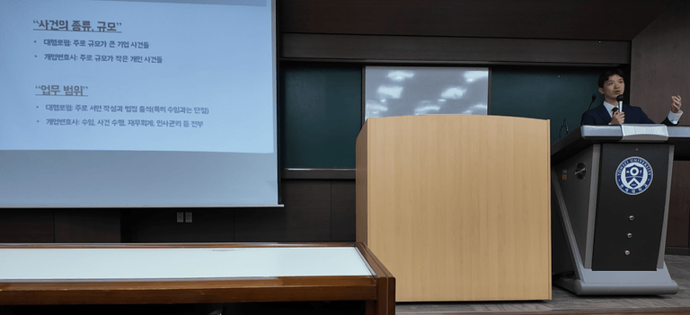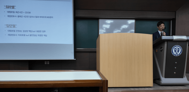 강연의 중심은 대형로펌과 개업 변호사의 삶을 직접 비교하는 데 있었습니다.