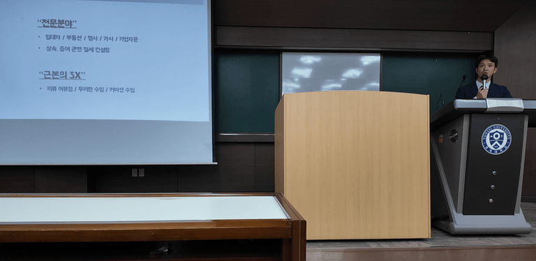 이번 강연은 단순한 진로 탐색을 넘어, 대형로펌에서의 현실과 개업 변호사로서의 삶, 그리고 그 사이에서의 고민과 선택을 진솔하게 풀어낸 자리였습니다.