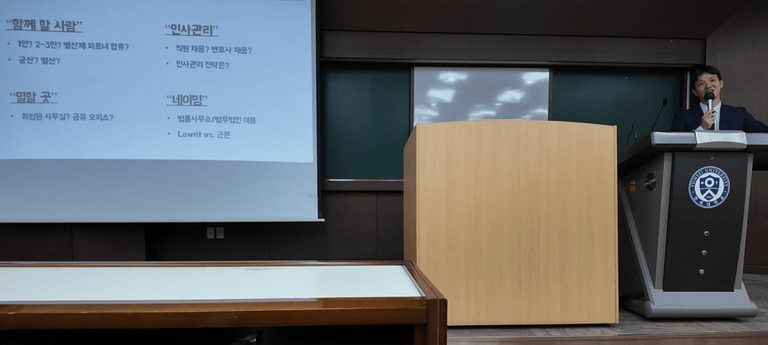 강연 중에는 ‘함께 개업할 사람과의 신뢰’, ‘공동 운영 방식’, ‘직원 채용 시기’, ‘로펌 네이밍 전략’ 등 개업과 관련된 실무적 고민들도 다양하게 공유되었으며, 특히 “수임보다 중요한 건 함께 일하는 사람의 마음가짐”이라는 메시지는 로펌 운영의 철학을 고스란히 담고 있었습니다.