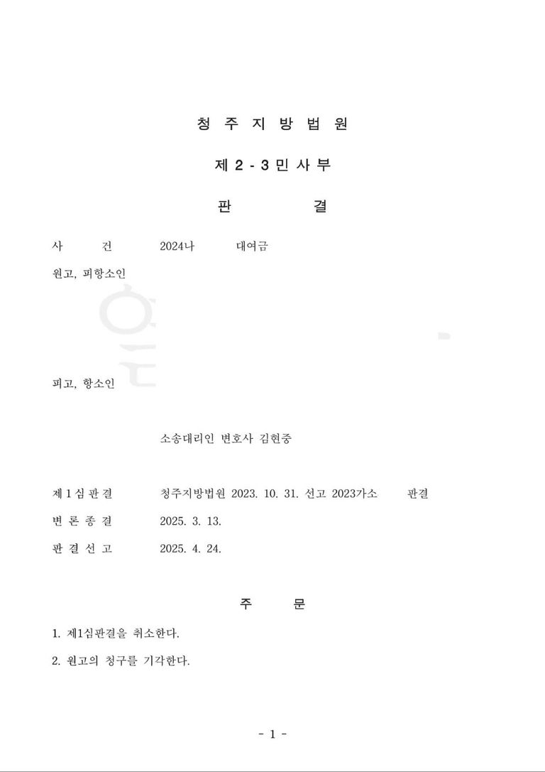 결국 1심 판결은 전부 취소 되었고, 피고는 항소심에서 전부승소할 수 있었으며, 저를 선임하면서 지출한 변호사비용 또한 원고로부터 회수할 수 있었습니다.