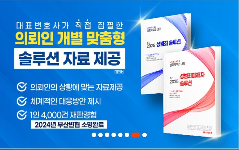 성범죄 피해자를 위해서 1. 반드시 유죄를 성립시키는 고소장 작성 방법과 2. 경찰조사 받는 방법, 3. 법원 증인신문을 하는 방법 등의 의뢰인용 솔루션 교재를 제공하여 유죄를 성립시키는 확실한 방법을 가르쳐 드리며, 또 형량을 최대한 올릴 수 있는 4. 엄벌탄원서 작성을 하는 방법 등 성범죄피해자를 위한 시스템이 완비되어 있습니다.