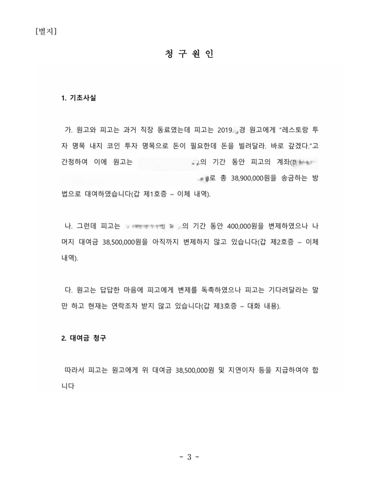 의뢰인은 직장 동료였던 피고의 부탁으로 차용증 없이 거액을 빌려주었으나 피고는 소액만 변제하고 나머지 대여금을 변제하지 않아 의뢰인은 저를 찾아오셨습니다.