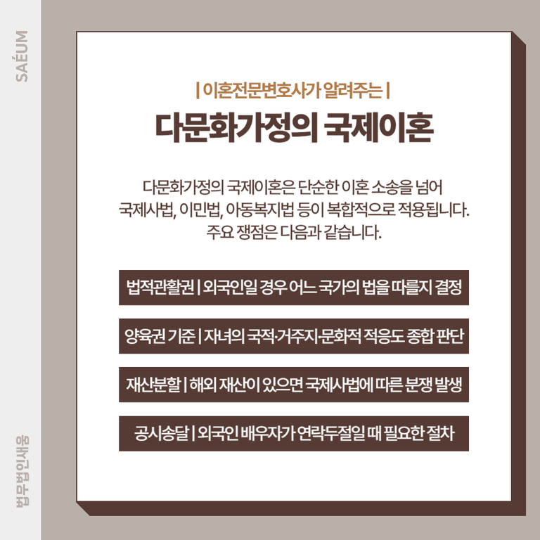 다문화가정의 국제이혼은 단순한 이혼 소송을 넘어 국제사법, 이민법, 아동복지법 등이 복합적으로 적용됩니다. 주요 쟁점은 다음과 같습니다.