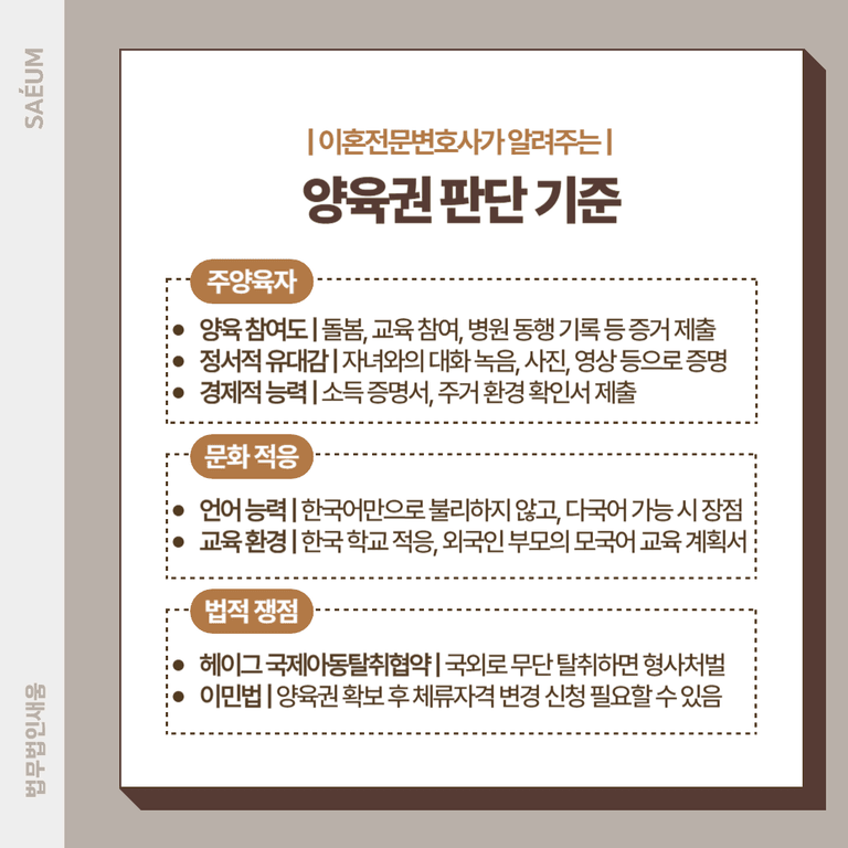 양육권 기준: 자녀의 국적, 거주지, 문화적 적응도 등을 종합해 판단합니다.